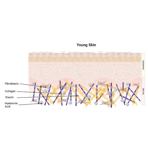 When you are young, your skin is naturally rich in fibroblasts - the cells that produce collagen, elastin and hyaluronic acid. This means your body creates these vital building blocks in abundance, keeping your skin firm, smooth, plump and well-hydrated. That's why young skin looks radiant, bouncy and full of life.